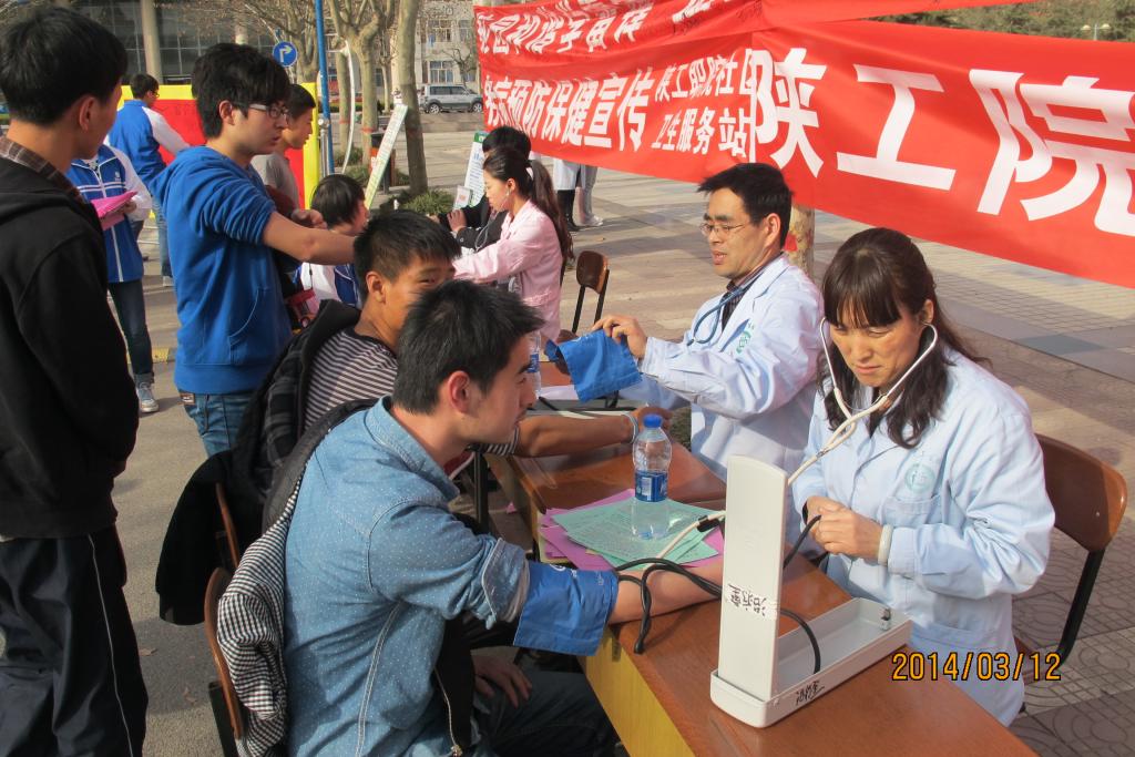 学工办老师和校医院负责人亲临现场组织协调,下午4点,活动正式开始。学生会志愿者向来往同学发放健康保健宣传单,讲解春季高发疾病及防护措施,同时向他们宣传环保知识,劝导大家爱护卫生环境,共创绿色家园。医护人员为大家提供免费体检及诊治,普及医疗保健常识,倡导绿色养生。活动受到师生好评,前来问诊的师生及居民络绎不绝。志愿者耐心的向前来咨询的人员解答疑问,协助他们测量身高及体重,并解释个人的身高体重指数。医护人员专注的听诊、测血压,为前来问诊的师生检查身体并向其说明体质情况。每位参与人员最后都在精美的宣传版上签字,为弘扬雷锋精神,传播志愿服务表达支持。