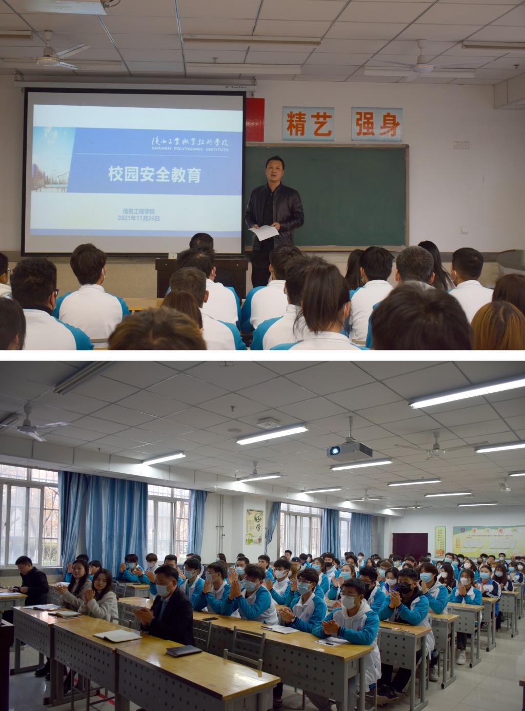 为进一步提高学生的安全防范意识和自护能力,维护校园安全稳定。11月26日下午,信息工程学院在崇明楼101教室召开了“校园安全教育警示”动员会。会议邀请学校保卫处治安科科长王海虎老师对全体学生代表进行培训,2020级、2021级全体辅导员,各班班长、团支书共100余人参加了会议。