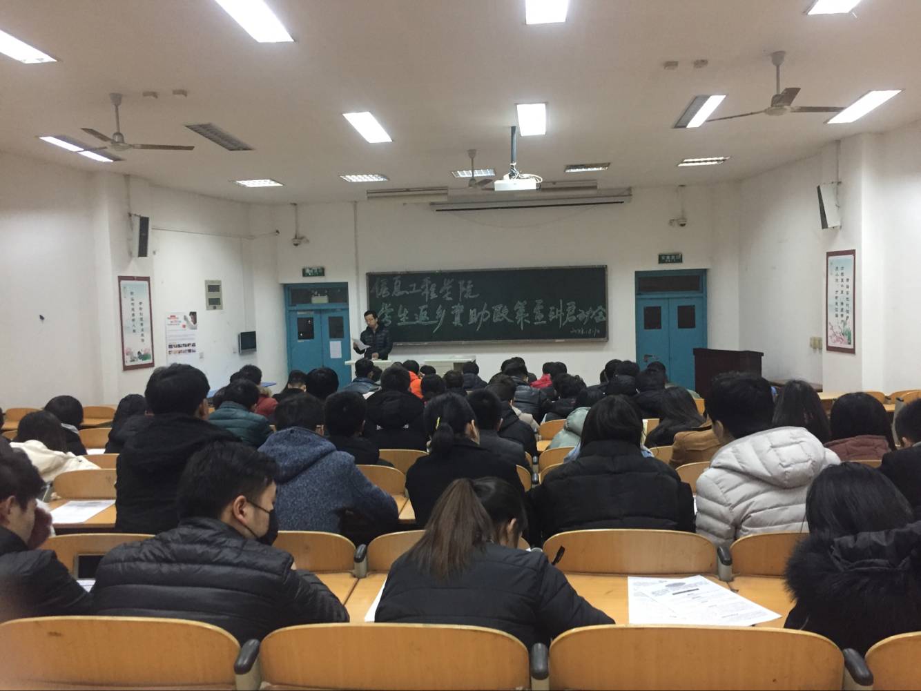 寒假将至,为把党、国家和学校对家庭经济困难学生的关怀落实落细,信息学院特成立了学生资助政策宣讲团,积极开展“寒假送温暖,政策暖人心”活动,并于2018年1月17日下午在崇文西楼102教室召开受助学生返乡资助政策宣传启动会,会议由辅导员杨阳主持,信息学院学工办全体老师、资助政策学生宣传大使近100人参加了会议。