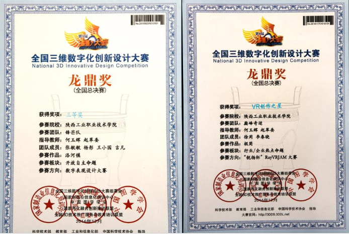 12月8日至12日,2016年第九届全国三维数字化创新设计大赛全国现场总决赛在江苏常州举行,我院信息工程学院教师赵革委、何玉辉指导的图形图像制作专业1404班学生张敏敏、杨彤等同学制作的三维漫游作品《洛河镇》获得“数字化表现设计”大赛全国三等奖。图形图像1504班徐周、1501班李春晓同学参加首届“锐扬杯”RayVR JAM大赛并获得“VR创作之星”奖。