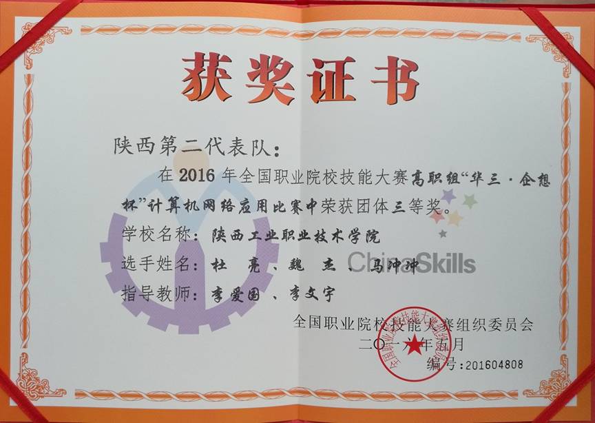 5月26日,2016年全国职业院校技能大赛高职组“华三·企想”杯计算机网络应用赛项比赛在江苏经贸职业技术学院圆满结束,全国29个省市的58支代表队参加了比赛,经过了四个小时的激烈比拼,由我院信息工程学院教师李爱国、李文宇指导的网络1401班杜亮、信管1402班马冲冲和计应1401班魏杰等3名同学荣获团体三等奖。