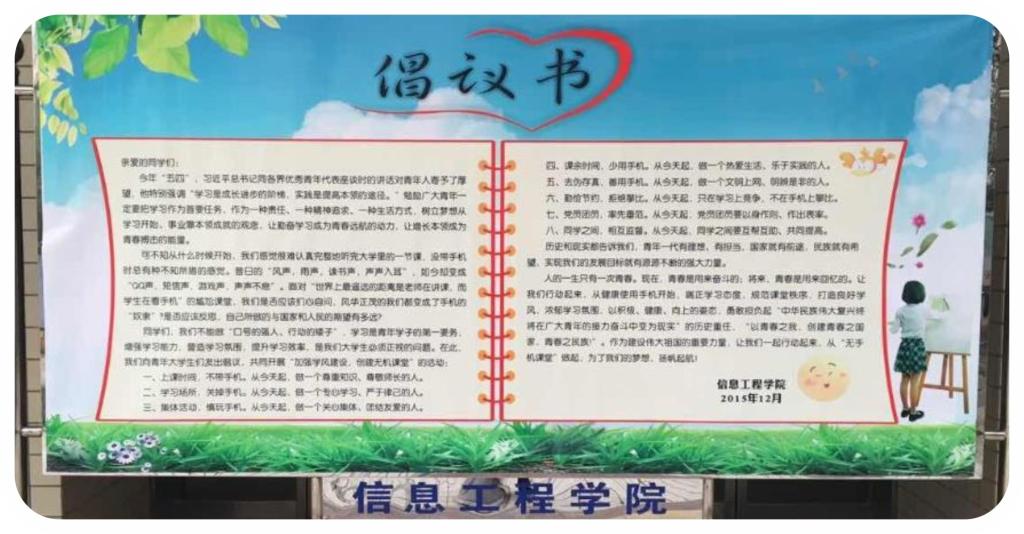 时下一句“世界上最远的距离是我在你身边,你却在玩手机”流传广泛,这一现象正在严重侵蚀着我们的课堂,为形成良好的教学秩序,不断纠正和净化课堂坏习气,信息学院团总支与学生会学习部联合倡议全体学生“加强学风建设.营造无机课堂”,并于12月20日晚组织2015级13个班级召开“远离手机.亲近课堂.备战期末.诚信考试”主题班会,2015级全体班主任主持,各班以多种形式开展讨论,班会现场同学们纷纷表态:让手机远离课堂,从自身做起;备战期末考试,从现在做起;考场恪守诚信原则,认真细致答题,给家长交上入校来第一次考试的满意答卷。