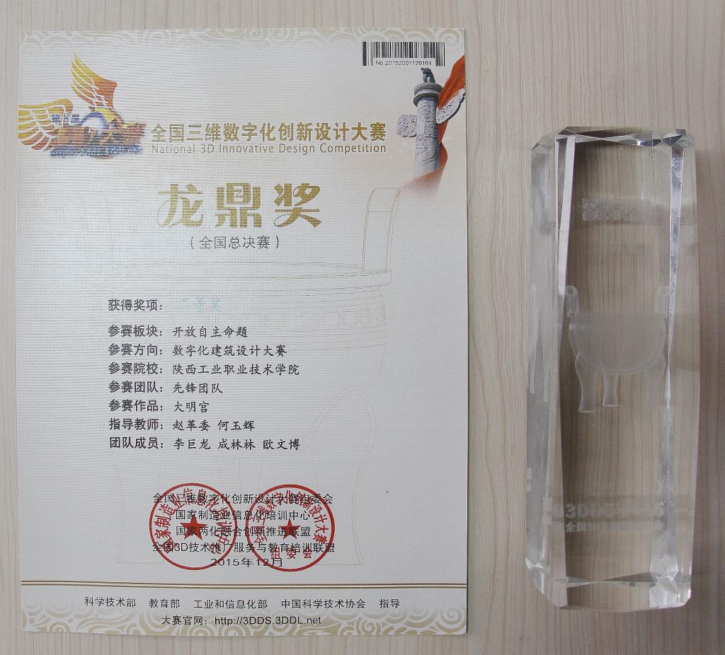 12月4日至8日,2015年第八届全国三维数字化创新设计大赛全国现场总决赛在江苏常州举行,我院信息工程学院教师赵革委、何玉辉指导的图形图像制作专业1303班学生李巨龙、欧文博、成林林等3名同学制作的三维漫游作品《大明宫》获得“数字化建筑设计大赛”赛项全国二等奖。