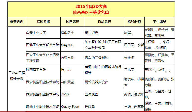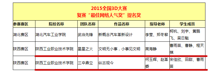 近日,全国三维数字化创新设计大赛陕西赛区复赛结果揭晓,我院信息工程学院选送的8组作品,获得特等奖1项,一等奖2项,二等奖2项,三等奖2项。