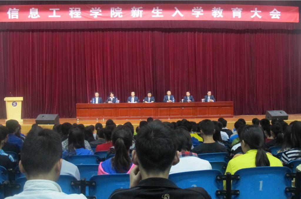 九月的校园,草木丛生,在绵绵秋雨中信息工程学院喜迎560余名新同学。9月13日和14日,陆续进行了参观实验室、参观图书馆等入学教育环节,9月14日上午,信息工程学院在明德堂召开2014级新生入学教育大会。信息学院党总支书记杜云,院长何玉辉,副院长夏东盛,教务处副处长赵明威,学生处教育管理科科长王康虎,信息工程学院教管办主任刘引涛,学工办主任曹伟,全体辅导员,新生班主任以及全体新生参加了会议,大会由院长何玉辉主持。