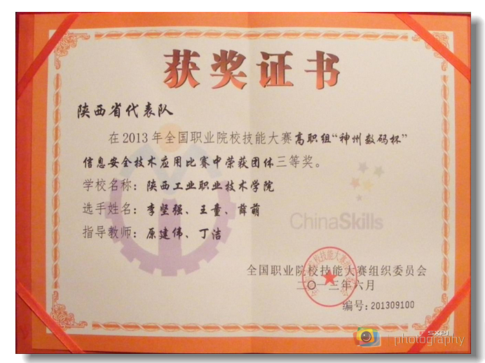 6月27日,2013年全国职业院校技能大赛“信息安全技术应用”赛项在天津市落下帷幕,该赛项汇 聚了来自全国26个省市自治区66所高职院校的网路高手。经过在天津电子信息职业技术学院6个小时的比赛,我院信息工程学院学生李坚强(计控1001班)、薛萌(软件1102班)、王童(计应1102班)代表陕西省一队荣获团体三等奖。