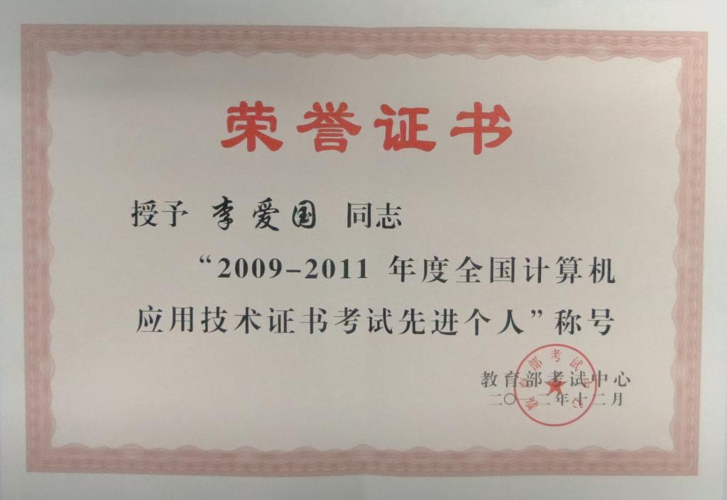 近日,教育部考试中心在重庆召开全国社会考试工作会,对三年来奋斗在全国社会考试管理战线并做出突出贡献的先进集体和先进个人进行了表彰。我院李爱国老师被评为“2009-2011年度全国计算机应用技术证书考试先进个人” 称号。据悉,全国仅43人获得此项荣誉。