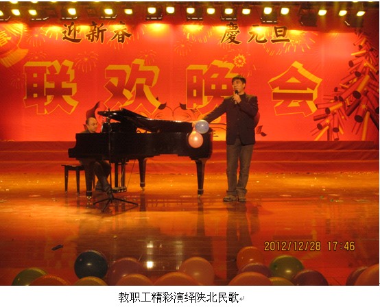 联欢会在深情的“陕西工院校歌”大合唱中拉开了序幕。街舞、独唱、舞蹈串烧、歌曲串烧、小品、诗歌朗诵、双簧、搏击操、手语、口琴独奏等节目倾情登场。精彩纷呈的节目层出不穷,蒋鹏、曹伟两位老师强强联合,在蒋鹏老师美妙的钢琴伴奏下,曹伟老师的陕北民歌悠扬绵长。节目表演现场,还加入了抽奖环节以及实时微博互动。最后,手语《感恩的心》为本次联欢会画上了圆满的句号。