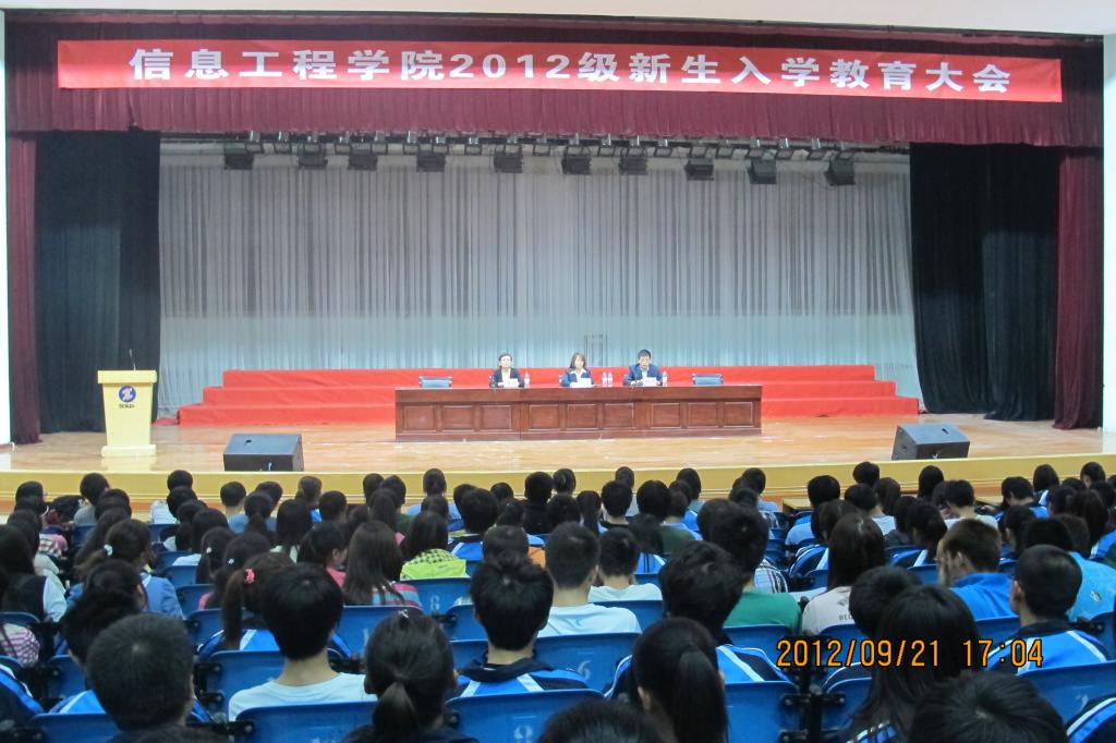 9月21日下午,信息工程学院近500名师生齐聚一堂,在明德堂召开2012级新生入学教育大会。信息学院党总支书记杜云、副院长夏东盛、图书馆办公室主任王丁以及信息学院全体辅导员和新生班主任等参加了会议,大会由副院长夏东盛主持。