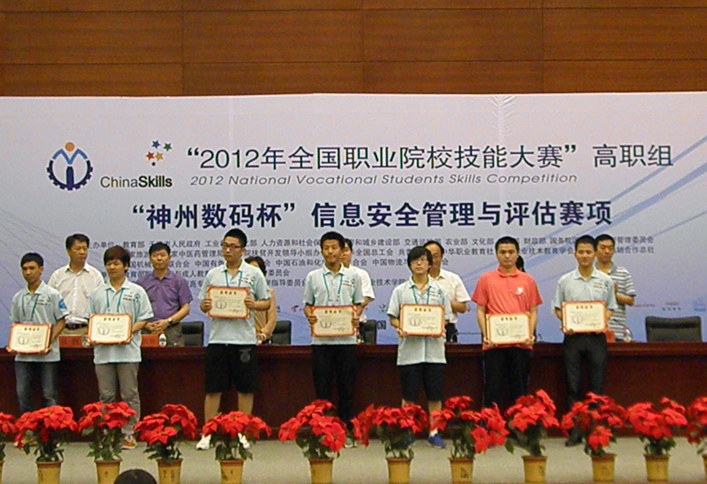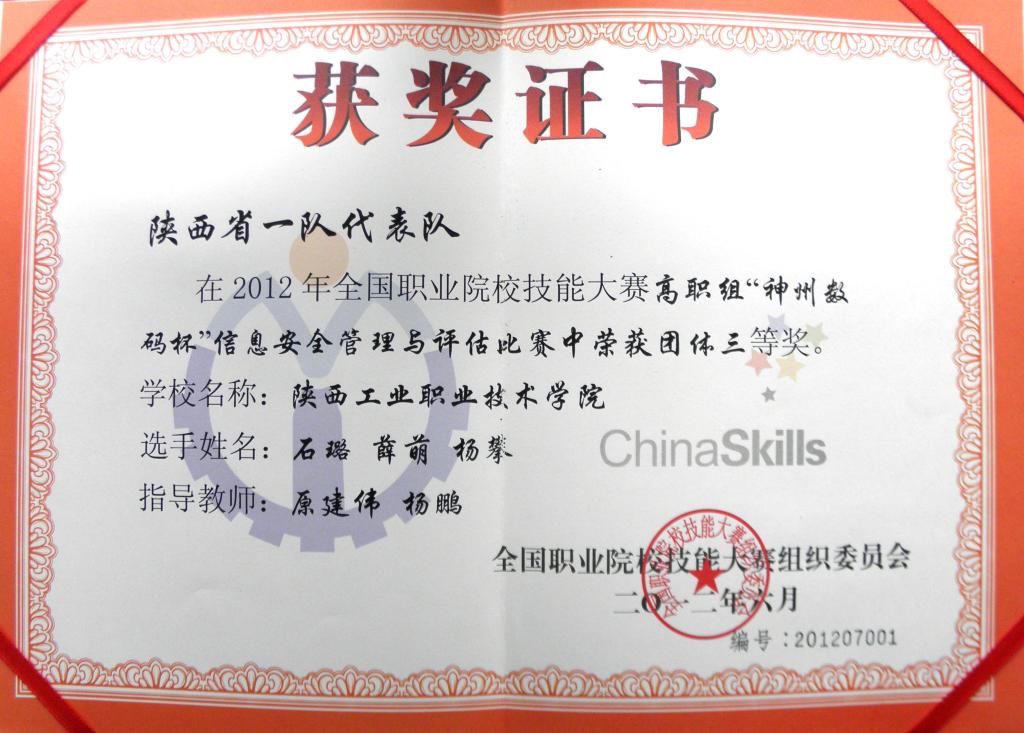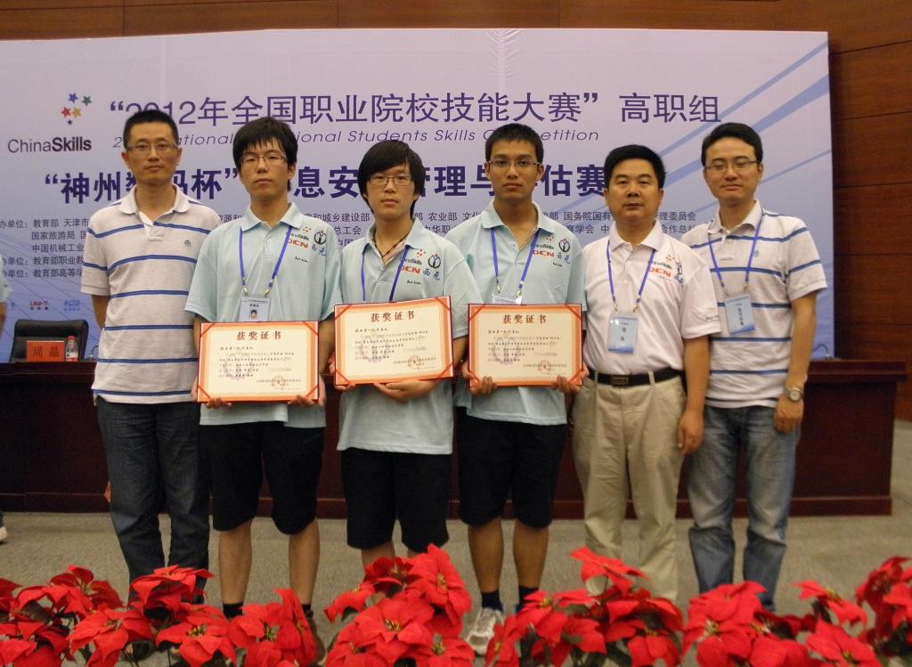 6月27日,在天津市举行的2012年全国职业院校技能大赛高职组“信息安全管理与评估”竞赛中,由信息工程学院原建伟、杨鹏老师指导的,网络1001班石璐、信管1001班杨攀和软件1101班薛萌同学组成的陕西省一队荣获本次比赛的团体三等奖,成为该赛项设置以来陕西省首次获得该奖项的参赛队。