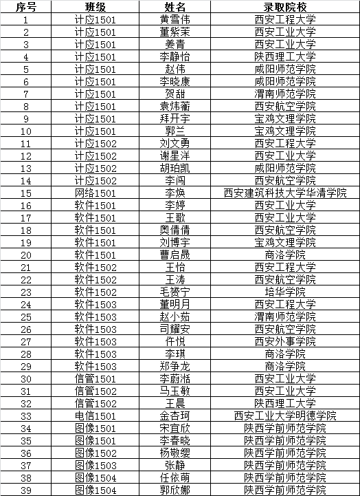 2018年专升本录取工作基本结束,我院共有62名学生参加,其中39名学生达到专升本最低控制线并全部被本科院校录取,占全院专升本上线人数的63%,创信息工程学院专升本历史最好成绩。以下39名同学最终被西安工业大学、西安工程大学、陕西理工大学、咸阳师范学院、渭南师范学院、西安航空学院、宝鸡文理学院、西安外事学院、陕西学前师范学院、西安工业大学明德学院、西安建筑科技大学华清学院、培华学院、商洛学院等13所本科院校录取。