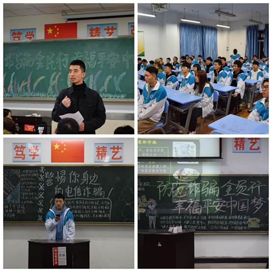 班会上各班级主要以班委宣讲、观看视频、播放PPT等形式为同学们讲解常见的诈骗手段,分析网络诈骗案例,让同学们更加认识到网络诈骗随处可见同时提醒同学们要时刻加强防范,并对部分同学的错误观念进行积极引导改正,提高同学们对网络诈骗的警觉。除此之外要引导学生树立正确的世界观、人生观、价值观。让他们学业为主,积极参加各类有益身心健康的活动,不要过度沉湎网络世界。