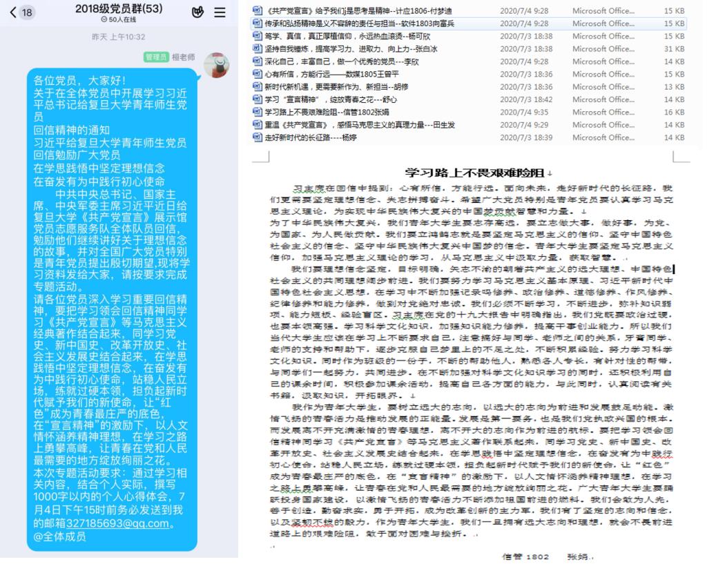 中共中央总书记、国家主席、中央军委主席习近平近日给复旦大学《共产党宣言》展示馆党员志愿服务队全体青年师生队员回信,勉励广大党员在学思践悟中坚定理想信念,在奋发有为中践行初心使命,信息学院学生第一党支部通过党员QQ群发送【读史】--《共产党宣言》与中国的结缘、【党员必修课】--听总书记谈《共产党宣言》、习近平给复旦大学《共产党宣言》展示馆党员志愿服务队全体队员回信原文等资料,要求各位党员认真学习、深入思考,撰写学习心得。活动开展一天来,党员们静下心来结合个人学习情况、自身理解角度、未来前行目标谈了体会。纷纷表示:坚决按照习近平总书记提出的学理论、学“四史”的具体要求去贯彻落实,在“宣言精神”的激励下,以人文情怀涵养精神理想,牢记总书记的嘱托,担负起新时代赋予的新使命,在学习路上矢志奋斗,让“红色基因”成为新时代最强大的生命力,坚持所信,铸就火热青春,让青春的智慧与力量凝聚起中国梦的磅礴之力。