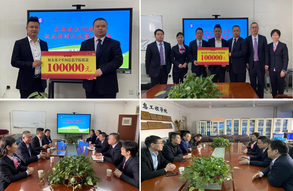 院长张磊对校友的到来表示热烈的欢迎,并向校友介绍了信息工程学院近年来在专业建设、人才培养、师资队伍建设、科研成果、技能大赛、联办本科等方面取得的进展和成绩。软件技术2006届毕业生、晨威国际货运代理深圳有限公司合伙创办人苏立军向母校捐赠10万元,为母校70周岁生日献礼,用于在校优秀学生的奖励,以此来表达对母校深深的思念之情、真诚的感恩之心、浓烈的拳拳之心和激励学弟学妹的殷殷之情,院长张磊代表学院接受捐赠,总支书记闫军向其发放捐赠证书。