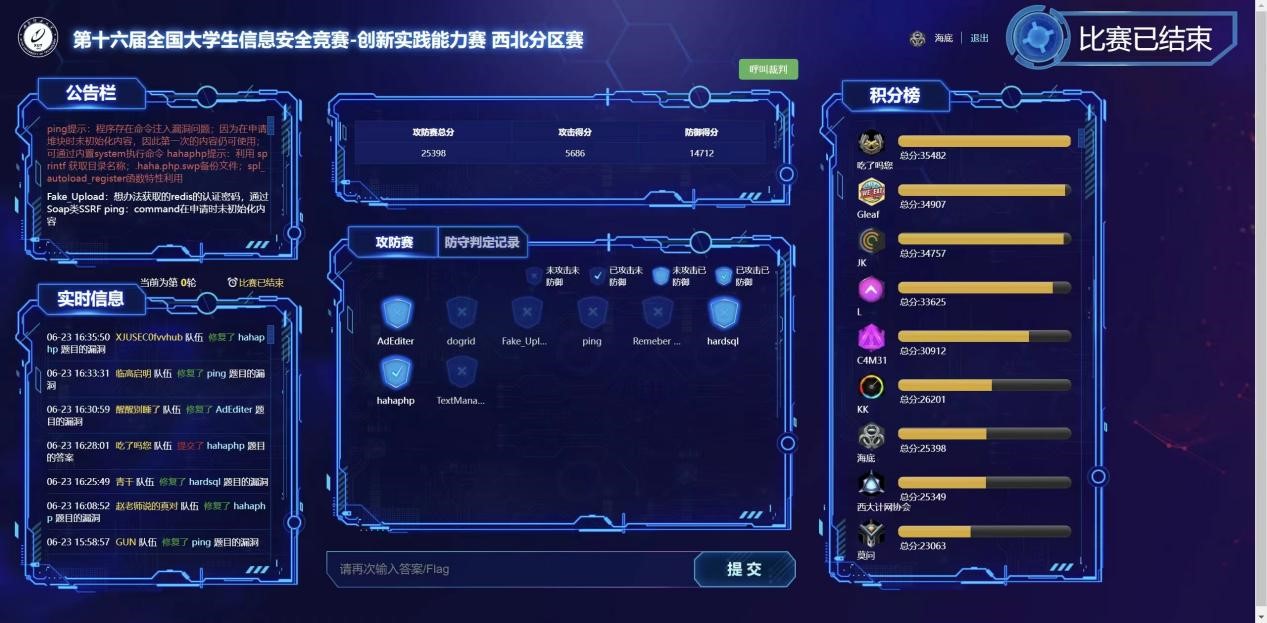 6月23日,2023年第十六届全国大学生信息安全竞赛创新实践能力赛西北赛区分区赛在西安理工大学举行,来自西安电子科技大学、西安邮电大学、西北工业大学、西安理工大学等30所高校,53支战队一较高下,由我院信息工程学院杨鹏老师指导-安全与测试工作室的成员:网络2003班豆凯歌、网络2102班刘德辉、网络5191班魏子恒、网络2102班董丹丹组成的海底战队,经过5月27日-5月28日线上初赛和和6月23日线下区域决赛,激烈角逐,斩获分区赛一等奖,成功晋级决赛。