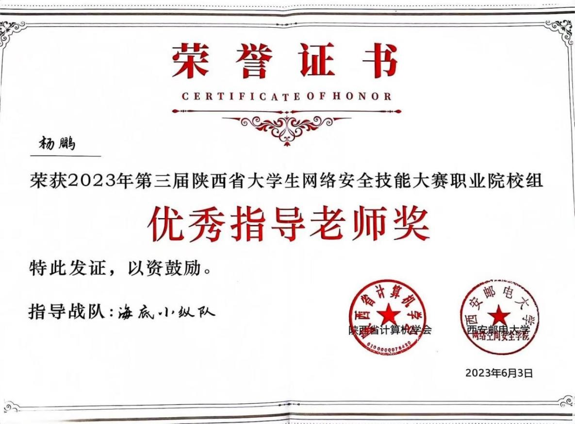 6月3日,由陕西省计算机学会主办,西安邮电大学网络空间安全学院、西安四叶草信息技术有限公司承办的2023年第三届陕西省大学生网络安全技能大赛-职业院校组在线上举行,来自全国150个高校队伍一较高下,由我校信息工程学院杨鹏老师指导的6名同学(两个战队),荣获一等奖和优秀奖各一项。
