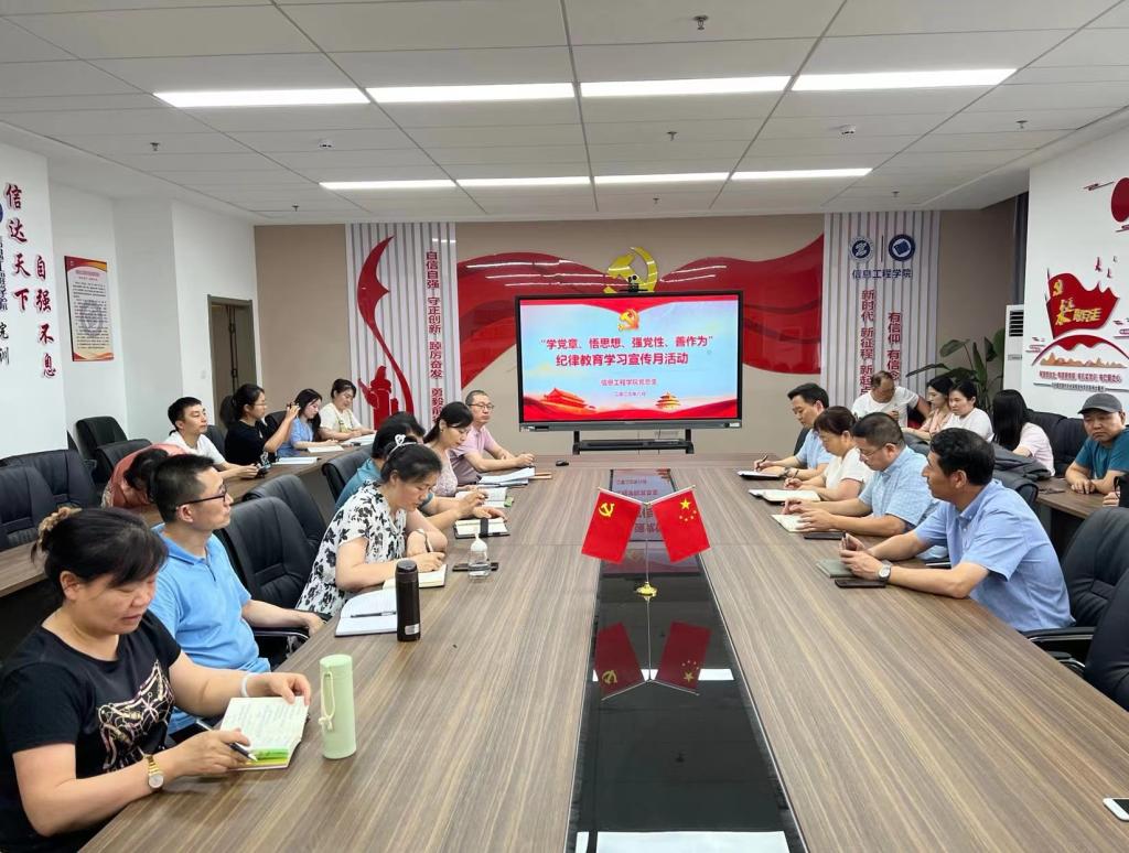 根据学校《2023年关于开展纪律教育学习宣传月活动的实施方案》文件要求,为进一步强化纪律教育的重要性,引导广大党员同志坚定理想信念、强化纪律意识。6月26日,信息工程学院党总支在崇理楼C-801开展了“学党章 悟思想 强党性 善作为”纪律教育学习活动,全体党员教师参会。