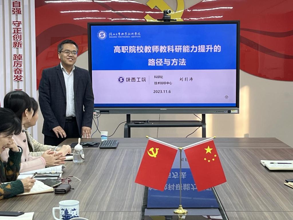 会上,刘引涛处长作了题为《高职院校教师科研能力提升的路径与方法》的专题报告,解读了《陕西工业职业技术学院横向科研项目及经费管理办法》《陕西工业职业技术学院科技成果转化管理实施办法(修订》《陕西工业职业技术学院知识产权(专利)管理办法》等相关文件,重点对科研管理工作、课题申报注意事项、经费报销制度科研平台搭建、考核及奖励等相关内容进行了深入解读,进一步加深了全体教职工对相关科研政策的了解。白国政院长随后进行了科研动员,鼓励学院教师,特别是博士、青年教师要积极树立科研意识、参与科研活动,不断提升个人水平与素质,以科研促进教学。
