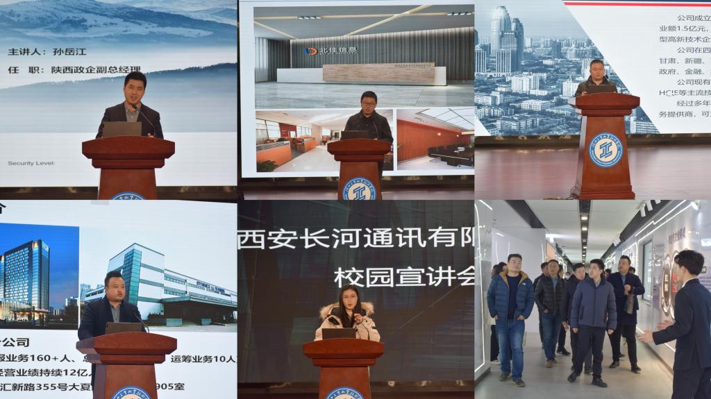 首先,华为陕西政企业务副总经理孙岳江进行了题为《ICT人才需求及其职业发展路径》的讲座,为现场的同学们深入浅出地介绍了云计算、大数据、人工智能、物联网、通信、网络等行业人才需求以及行业现状。接着,华为生态企业代表们的发言进一步覆盖了行业趋势、职业路径、岗位技能要求及晋升机会等多个方面,让学生对ICT行业有了更加深入的了解,也为学生未来职业发展提供了宝贵指导。讲座结束后,华为陕西政企业务副总经理孙岳江及其团队对华为产教融合实训基地进行了参观。